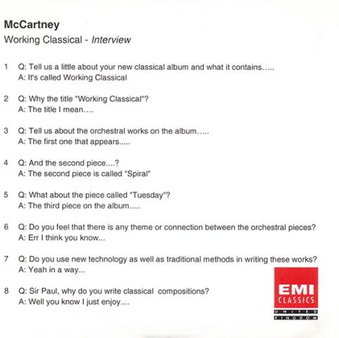 UK 1999 11 01 - PAUL McCARTNEY'S WORKING CLASSICAL - INTERVIEW - EMI CLASSICS 1999 McCartney"Working Clasical"Interview8 questions plus answers1999EMI ClasicsR-BZU