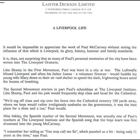 1991 06 28 b World Premiere Of Paul McCartney's Liverpool Oratorio - Press Release