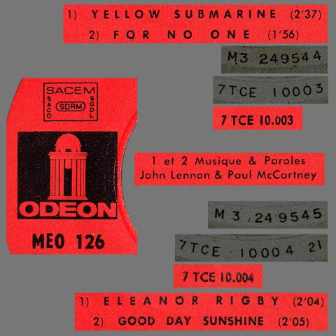 THE BEATLES FRANCE EP - D - 1971 06 00 - MEO 126 - SLEEVE 1 - LABEL B/B - SACEM REISSUE 1971 SACEM LEFTIDN LEFTYELLOW SUBMARINEFOR NO ONEELEANOR RIGBYGOOD DAY SUNSHINE
