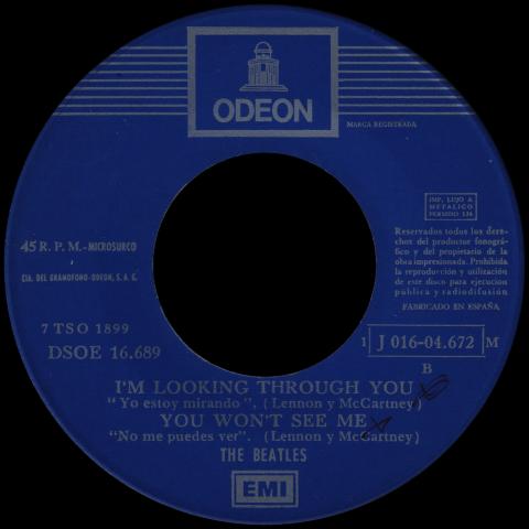 SP263 DRIVE MY CAR ⁄ NORWEGIAN WOOD ⁄ I'M LOOCKING THROUGHT YOU ⁄ YOU WON'T SEE ME 1966 ODEON DARK BLUE SMALL DOME DSOE 16.689 STICKER REMOVED 1 J 006-04.672 M 7 TSO 1898 / 9